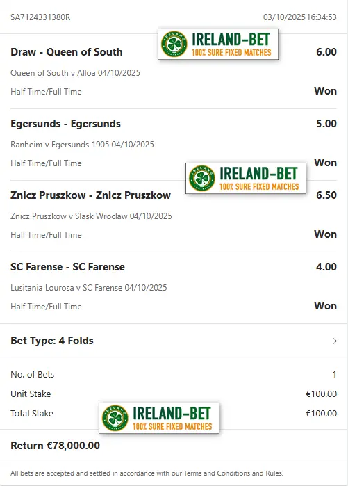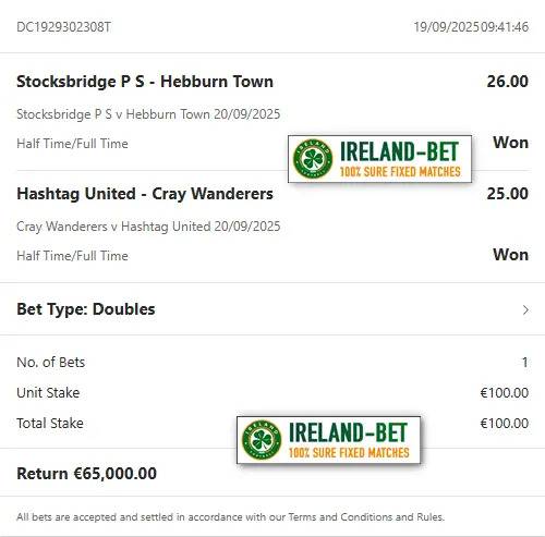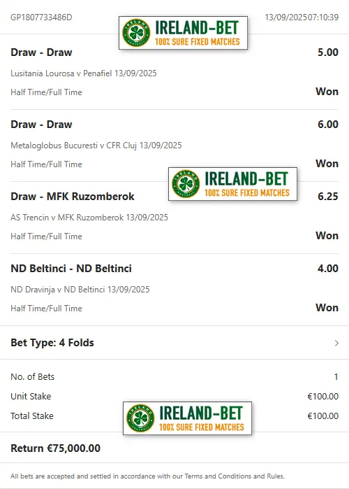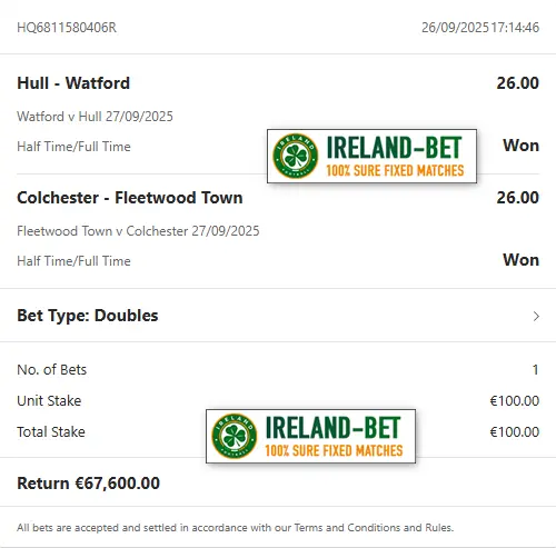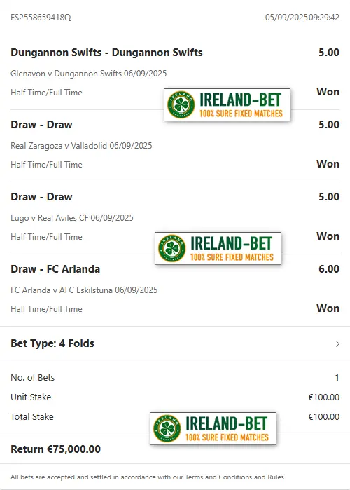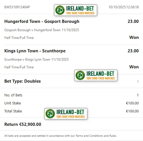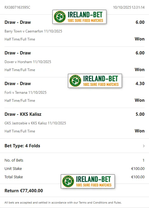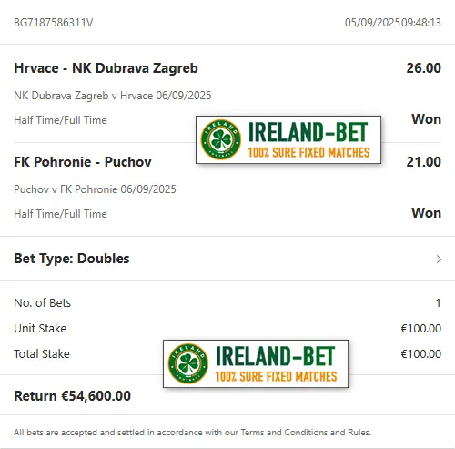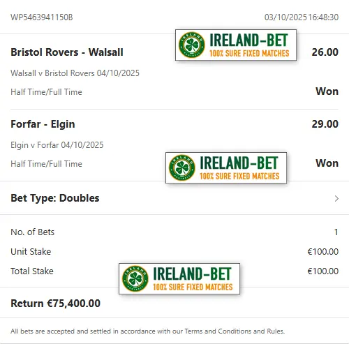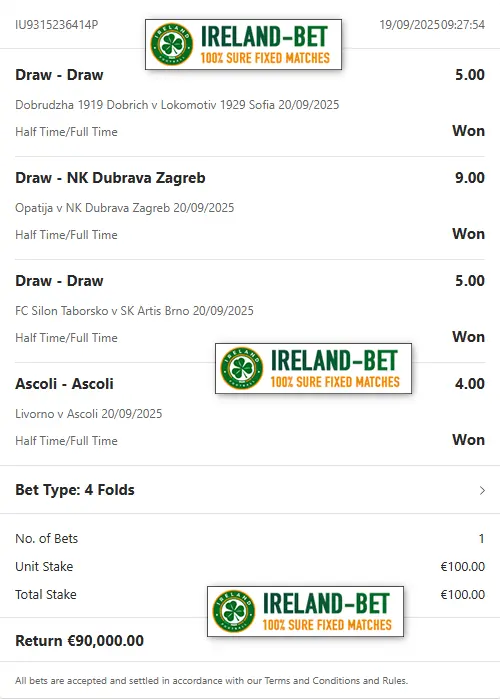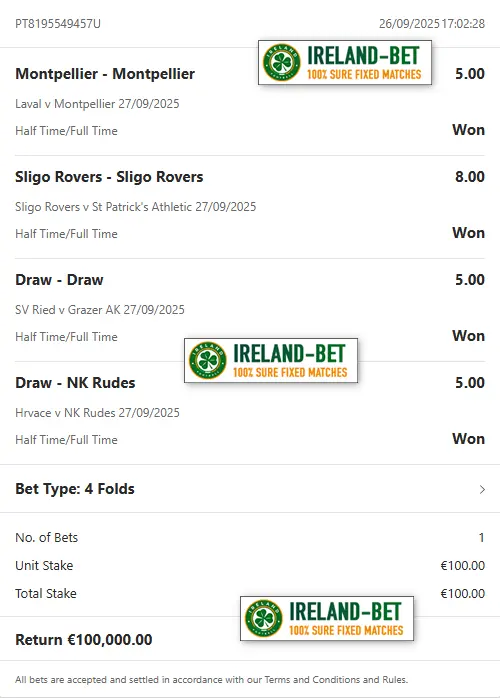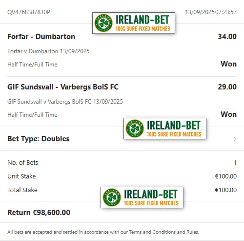 Ireland-Bet.com the best provider of fixed matches 100% sure.